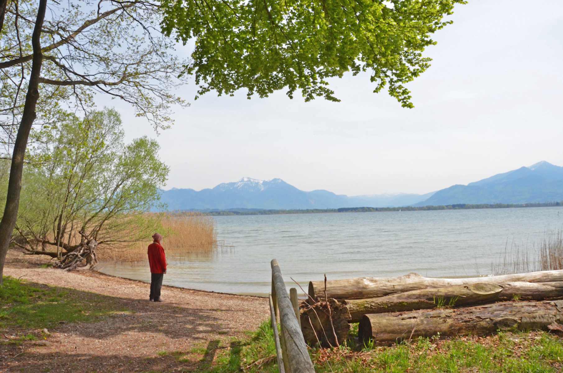 Weiter geht es durch einen prächtigen Buchenwald, nach dem verfallenen Wasserreservoir rechts halten in Richtung See. Nach kurzem Gehweg erreicht man die wunderschöne Bucht, Pauls Ruh. Am Ostufer geht man bis zur Auffahrtsallee von Schloss Herrenchiemsee.