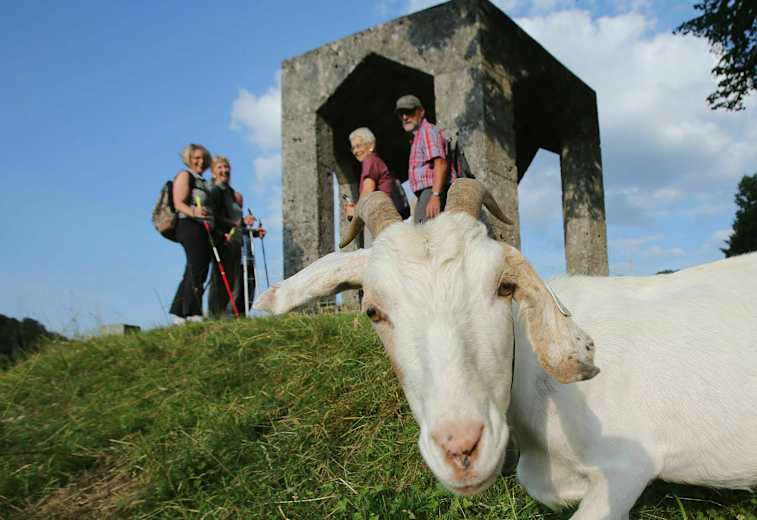 Auf der ersten Hälfte der Tour durchwandern wir ein Hochtal oberhalb von Seeburg, genießen herrliche Ausblicke auf den Ort und das gegenüber auf dem Berg thronende Schloss Uhenfels und passieren mehrere Viehgatter zwischen denen wir mit etwas Glück dem ein oder anderen Zicklein begegnen.