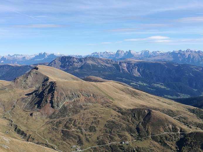 Man erreicht den Ausgangspunkt der Tour auch über die Fahrstraße über Hafling bis zum Parkplatz in Falzeben. Von dort mit der Kabinenbahn oder zu Fuß zum Piffinger Köpfl.