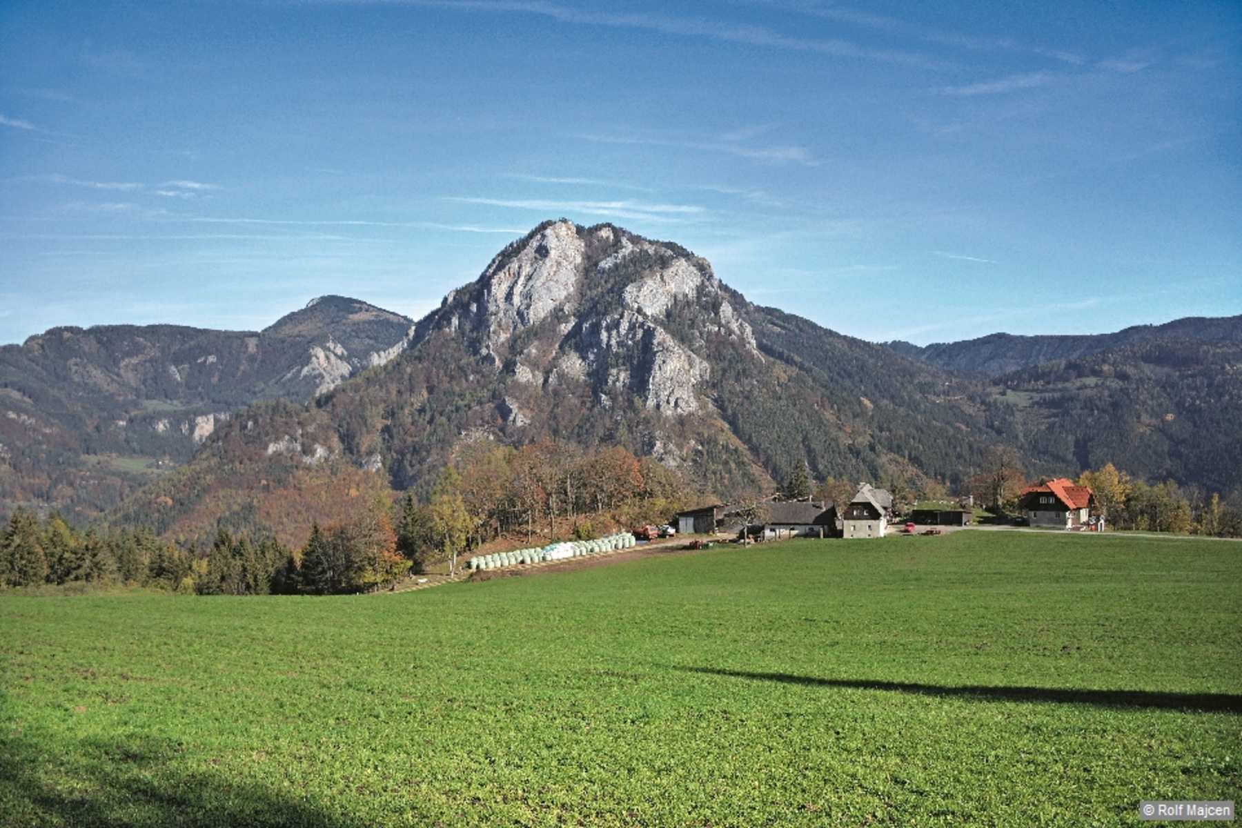 Wir verlassen den Parkplatz, 468 m, über die Brücke, folgen dem Wegweiser „Kreuzkogel, Schiffall“ nach rechts und wandern gut markiert und mitunter steil durch den Wald bis unmittelbar vor das Gehöft Gunacker, 765 m, das am unteren Rand einer prächtigen Weide liegt. Dort beachten wir den Hinweis auf die „neue Wegführe“, steigen sofort rechts am Wiesenrand auf – nicht durch das Anwesen – und haben einen erstklassigen Blick über den Hof hinweg zum Röthelstein. Die Aussicht ist phänomenal!