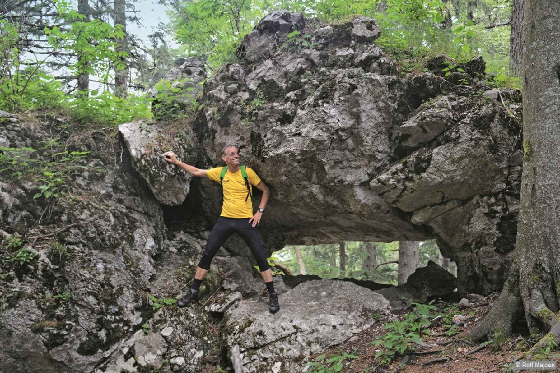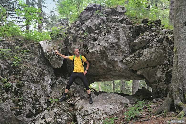 Danach zurück zur Wegteilung und weiter zum „Schiffall“. Rechter Hand gefällt ein Steinfenster, und wir staunen über die spannende Wegführung durch die bizarre und zum Teil von Moos überzogene Felslandschaft. Am kleinen bewaldeten Gipfelplateau, das an einigen Stellen sogar Fernsicht durch die Bäume hindurch bis zum Hochschwab zulässt, steht kein Gipfelkreuz; nur die Tafel „Schiffall, 1221 m“ und das Gipfelbuch geben uns Bescheid, dass wir uns am Schiffall befinden.