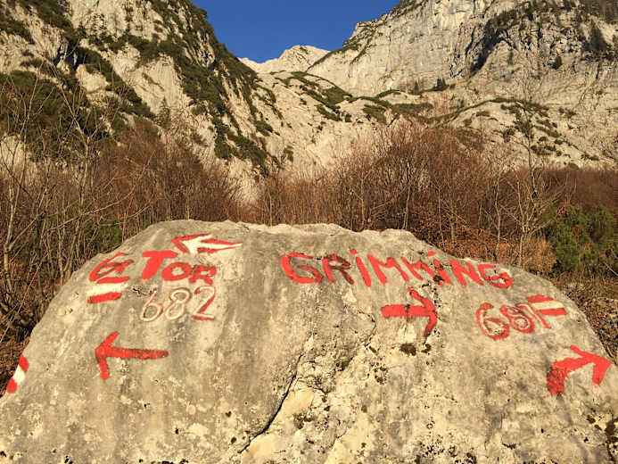 Der Abstieg erfolgt über das Multereck, welches man vom Grimminggipfel aus in Richtung Nordosten wieder auf dem Weg Nr. 681 erreicht. Über einen zum Teil versicherten Steig geht es zurück zum Ausgangspunkt.