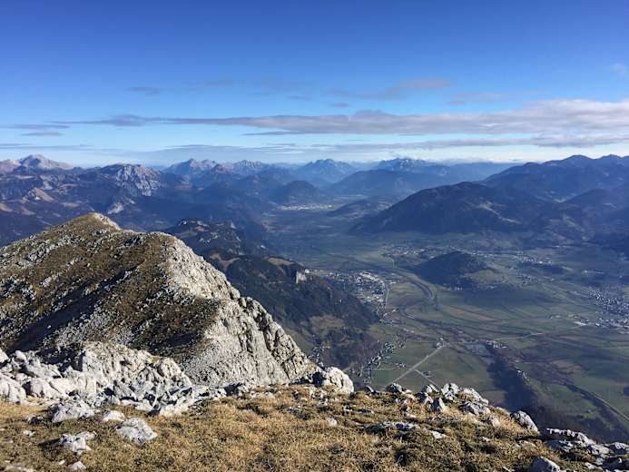 Bei klarer Sicht bietet der Gipfel ein beeindruckendes Panorama auf das Tote Gebirge, die Niederen Tauernund das Dachsteinmassiv.