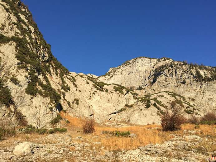 Über diese aufsteigen und dem Bergwanderweg weiter folgen bis man zur Wegkreuzung "Südgrat" und "Multereck" kommt. Hier links halten und nach einer kurzen Traverse in steileres Blockgelände. Dort nochmals links halten und den Markierungen über ein kleines Schotterfeld zur Plattenrampe folgen.
