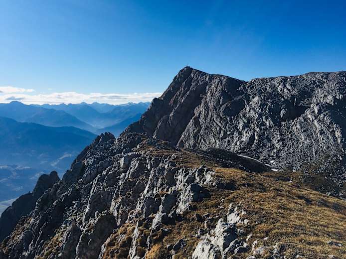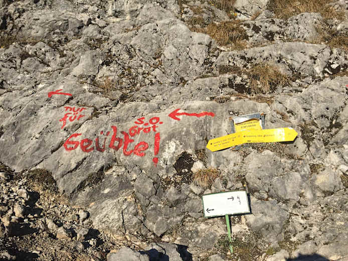 Der Aufstieg über die Rampe erfordert ab und an den Einsatz der Hände und konzentriertes Steigen. Wenig später ist der aussichtsreiche Südostgrat gewonnen und in schöner Kraxelei steigt man den Markierungen folgend hinauf zum Gipfel. Dabei müssen Stellen im 2. Schwierigkeitsgrad bewältigt werden, ohne dass der Weg jedoch wirklich schwer wird.