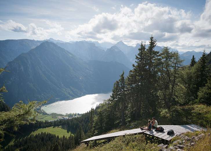 Eine gemütliche Abfahrt: Mit der Rofanseilbahn schwebt man von der Erfurter Hütte hinunter nach Maurach. Der Blick gleitet dabei über den Achensee und über die Gipfel der Tiroler Bergwelt. Bald wandert man anschließend am Süd-bzw. Südwestufer des Achensees weiter nach Pertisau. Im Falzthurntal wandert man auf einem asphaltierten Abschnitt zuerst zum Gasthaus Falzturn und Sennhütte, anschließend über einen Forstweg zur Gramaialm und immer noch weiter taleinwärts Richtung Lamsenjochhütte. Nun winden sich die Serpentinen aufs Joch bis man das Etappenziel, die Lamsenjochhütte erreicht.