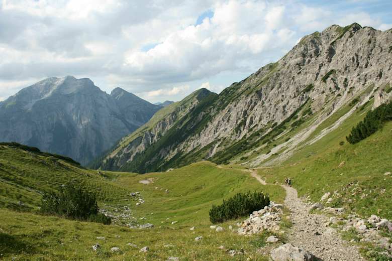 Unterhalb der Laliderer Wände, in der Falkenhütte, haben viele Gipfelgespräche stattgefunden, aber der Weg dieser Etappe führt durch sanfte Almwiesen abwärts. Nach der beschaulichen Ladizalm geht es durch lichten Wald über einen Karrenweg hinunter zum märchenhaften Kleinen Ahornboden, der landschaftlich ebenso beeindruckt wie sein großer Bruder. Nachdem man bisher keine Höhenmeter bewältigt hat ist man frisch für den nun anstehenden Aufstieg. In Richtung Nordwesten erreicht man das Untere Filztal, von wo aus noch 400 aussichtsreiche Höhenmeter bis zum Karwendelhaus zurückzulegen sind. Nun ist das Etappenziel erreicht und man kann in diesem schönen Schutzhaus in den Tiroler Bergen die vielen Eindrücke des Tages revuepassieren lassen.