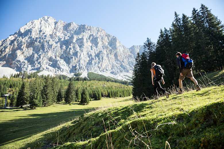 Unterhalb der Ehrwalder Alm beginnt der „Wiesenweg nach Ehrwald“. Er führt zunächst durchs Skigebiet, dann an der Weggabelung geradeaus bzw. rechts und ein Stück steil durch den Wald. Später leitet der Fußweg durch herrliche Bergmähder hinaus zur Talstation der Ehrwalder Almbahn. Nun noch das letzte Stück nach Ehrwald, entweder auf dem Zufahrtsweg oder auf dem Altmühlensteig, der ein paar Meter südwestlich der Talstation auf der orografisch linken Seite des Geißbachs beginnt.