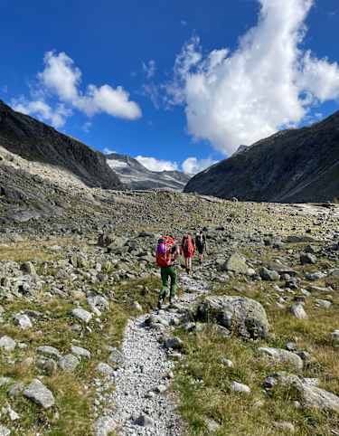 Bald blickt man auf den rauschenden Teischnitzbach hinunter und sieht die Eistürme des Teischnitzkees aufblitzen. Es gilt noch einige steile Wiesenhänge, Rippen und Rinnen zu überwinden, ehe man sich abschließend über Schutt und Steinblöcke von Süden der Stüdlhütte nähert (2.802 m). Sie steht am Fuß vom Großglockner, das Berg- und Gletscherpanorama ist dementsprechend grandios.
