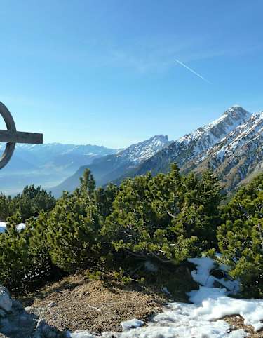 Da man sich dem Gipfelkreuz von der Rückseite nähert, wird erst direkt am Gipfel der schwindelerregende Blick auf die beinahe senkrecht erscheinende Flanke der Kirchbachspitze hinunter ins Tal frei.
