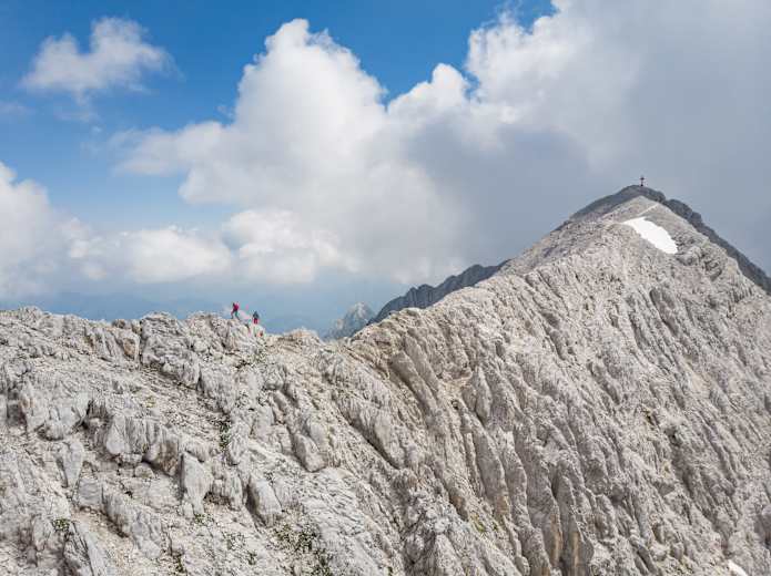 Von der Brotfallscharte steigt man über den felsigen Bergrücken hinauf zum Gipfelgrat. Über diesen schmalen Grat erreicht man den Gipfel des hohen Priel (2.515 m) mit seinem Gipfelkreuz.