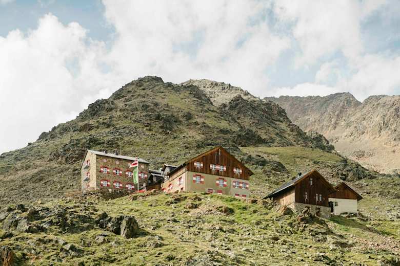 Die Breslauer Hütte ist ein idealer Einkehrstützpunkt auf dieser Tour. Von der Sonnenterrasse genießt meinen beindruckenden Blick auf die Ötztaler Alpen.