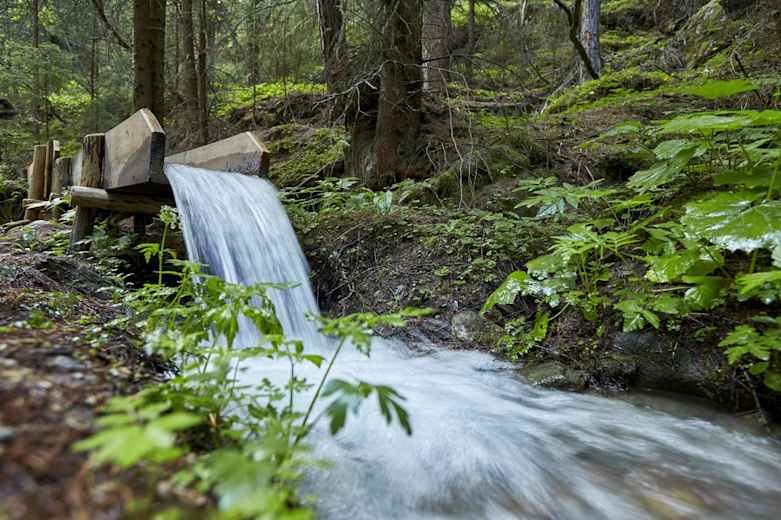 Weiter im Tal kommt man dem Wasser etwas näher, bis der Weg über eine Brücke zum Mooser Steg führt. Gut zu erkennen ist noch die „Waalführung“. Es geht jedoch immer entlang des moosigen Hanges gemütlich weiter.