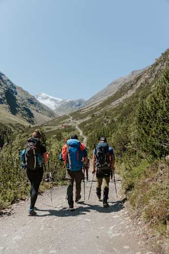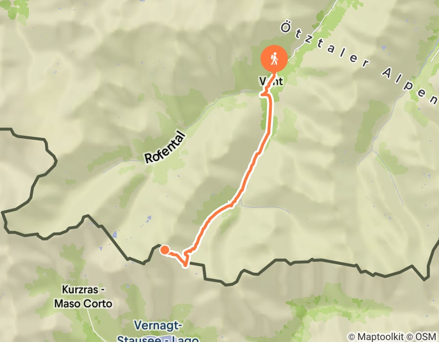 In Vent wandert man durch den Ort bis zur Brücke nach den letzten Häusern. Hier nimmt man nun den Weg Nr. 923, auch Via Alpina - Gelber Weg, ins Niedertal. Auf breitem Weg geht es konstant bergauf, vorbei an der Schäferkapelle bis zur Martin Busch Hütte (2.501 m).