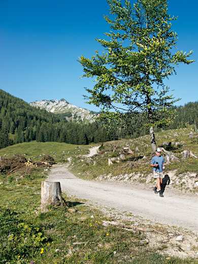 Ab hier beginnt das Almgebiet, der Wald zieht sich zurück. Weiter auf der Almstraße, bei der kommenden Kreuzung rechts und bis zu einem einzeln stehenden Bildbaum. Hier dem Wegweiser nach links folgen und auf einem Steig wildromantisch am Nappenbach entlang wandern (rot-weiß-rote Markierung).