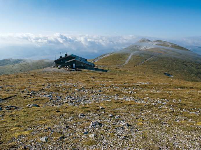 Die Hütte neben dem Klosterwappen in der Rax-Schneeberggruppe: Der Schneeberg, ein Kalksteinmassiv in den Niederösterreichisch-Steirischen Kalkalpen, ist mit einer Höhe von 2.076 m der höchste Gipfel Niederösterreichs. Der höchste Punkt des Schneeberges wird auch Klosterwappen genannt. Mit dem Gipfel des Kaisersteins (2.061 m), auf dem auch die Fischerhütte liegt, durch einen sanften Kamm verbunden, bildet der Schneeberg den östlichsten Zweitausender der Alpen.