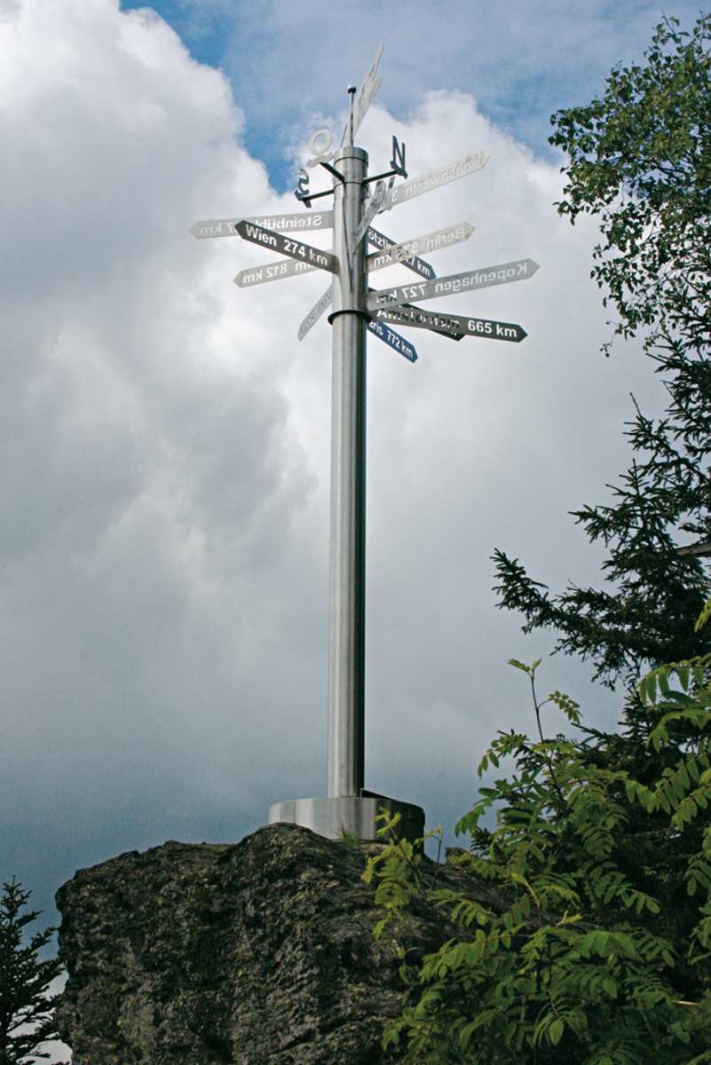 Am Kreuzfelsen verrät uns ein Wegweiser die Entfernung zu weit entlegenen Orten. Foto: Heike Oechler