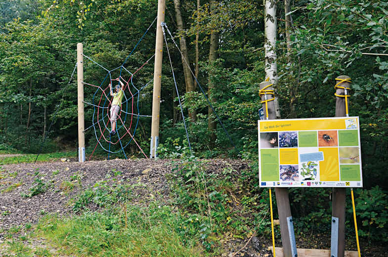 Der Weg wendet sich halb rechts auf breitem Weg zur Wegkreuzung mit der Station 4 „Die Welt der Spinnen“ mit einem großen Seilnetz zum Klettern.