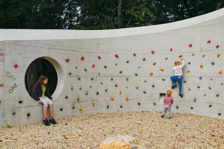 Ein paar Meter weiter, neben der Pferdekoppel, ist die Station 13 „Das alles ist Klettern“ mit der 5. und letzten Prägestelle. Drei Balancegeräte, darunter eine Slackline, laden hier zum Ausprobieren ein. Vor oder nach dem Essen hat man noch den Aussichtsturm oder Spielplatz am Programm. Und man kann bereits hier seine Stempel gegen eine kleine Überraschung eintauschen. Dann der Abstieg.