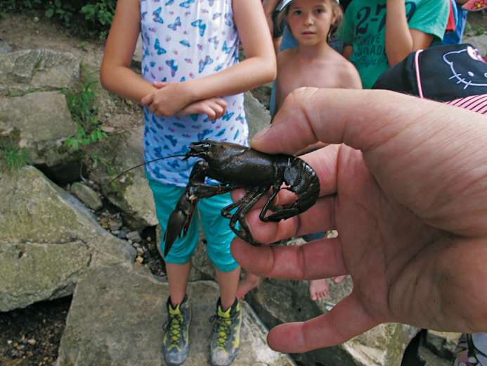 Links kommt man nach ca. 100 m zum Naturparkgasthof Klugmayer, der Weg führt aber rechts weiter, zuerst kurz die Straße entlang, dann auf einem Wanderweg am Waldrand zu den weiteren Erlebnisstationen mit Grünspecht SAWI bis zur Wasserstation am Wienfluss, wo auch Flusskrebse zu beobachten sind. Leichte Zugänge zum Wasser eröffnen immer wieder Bade- und Planschmöglichkeiten, aber Vorsicht auf den rutschigen Steinen! Von hier wandert man dann problemlos den Weg bis zum Parkplatz beim Naturparkeingang.
