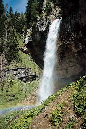 Der gut markierte Abstecher zum Fall sollte auf keinen Fall versäumt werden. Wild stürzt die Taurach in die Tiefe. Ein riesiger Regenbogen bildet meist ein herrliches Farbenspiel, und durch kühlenden Sprühregen gelangt man hinter den Wasserfall, ein einmaliges Naturerlebnis.