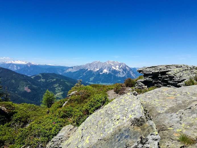 Weiter geht´s auf einem schmalen Steig bis zur Scharte. An der Abzweigung Mölbegg/Hochstein hält man sich leicht links und wandert über die Flanke hinauf bis zum Gipfel. Ein Gipfel mit Wumms, denn er gestattet einem eine 360° Panoramaaussicht vom Allerfeinsten - Grimming fußfrei, versteht sich.