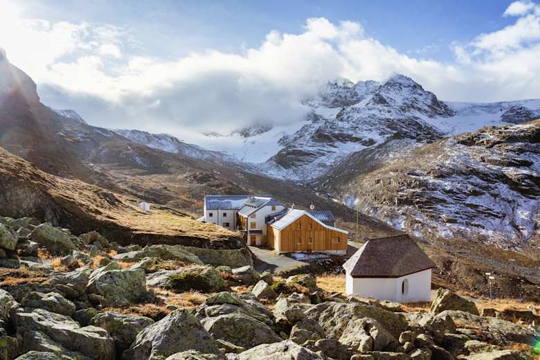 Die Wiesbadener Hütte auf 2.443 m bietet 80 Betten und 100 Lager und ist Ausgangspunkt für viele Touren sowohl im Winter als auch im Sommer.