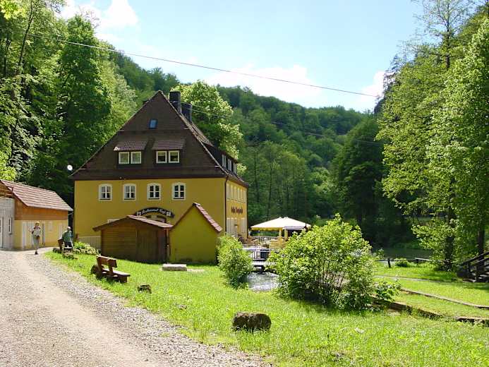 Dort angekommen folgt man der Markierung mit dem roten Kreuz flussaufwärts, an der Stempfermühle vorbei und man gelangt zum Aufstieg, welcher über den Frankenweg und durch den Eibenwald und den Felsensteig zurück nach Gößweinstein führt.