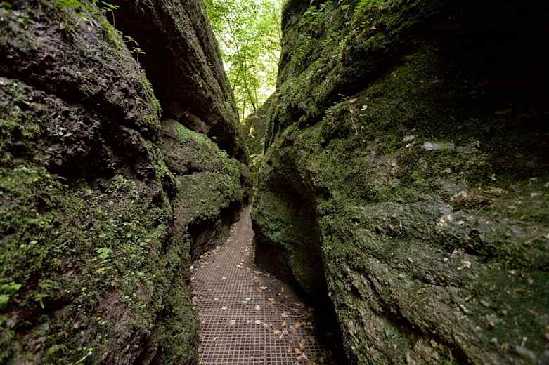 Über Jahrmillionen hat sich das Wasser eines Baches fast 10 m tief in die roten Felsen unterhalb der Wartburg gegraben. Es wurde durch die gut 200 m lange Klamm ein Weg errichtet, auf dem man direkt über dem kleinen Bach durch die phantastischen Felsformationen spazieren kann. Lohnende Wanderung in Deutschland.