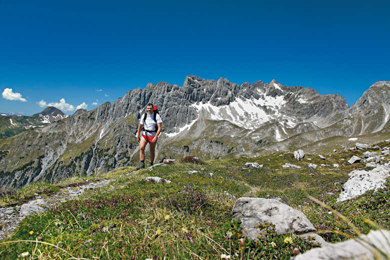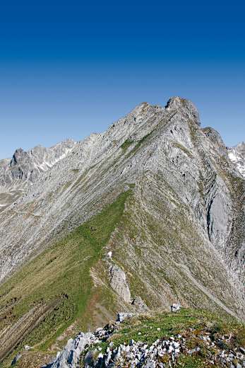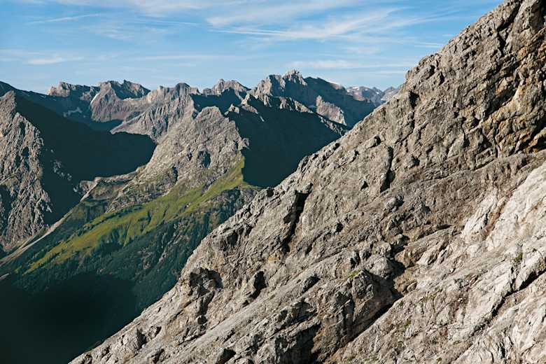 Mit gut 2.600 m Höhe zählt sie definitiv zur ersten Garnitur in den Allgäuer Alpen, obschon es – im Gegensatz zur benachbarten, klobigen Urbeleskarspitze – hier wenig zu klettern gibt: Ein Abstecher ist Ehrensache! In verwinkeltem und anspruchsvollem Verlauf schwenkt der Enzenspergerweg anschließend über Schwärzerscharte und Griesschartl in die südseitigen Kare der Hornbachkette, die nun nacheinander ausgegangen werden: Glieger-, Woleckles- und Sattelkar hinüber zum Luxnacher Sattel, das Noppenkar zum Balschtesattel und schließlich das Balschtekar zum Etappenziel bei der gemütlichen Hermann-von-Barth-Hütte. Man erkennt in so manch markanter, teils sogar skurriler Felsformation die Handschrift des Baumeisters Hauptdolomit und man kann seine Augen immer wieder mit der Fernschau über die Gipfelflur der Lechtaler Alpen beruhigen.