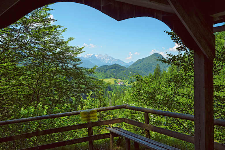 Die aus dem Fels gesprengte Naturstraße hoch über der Nothklamm (Achtung, keine Steine lostreten!) durch Wald und an Felswänden entlang nach rechts abwärts und durch drei kurze Tunnels, am Nothkreuz vorbei, zum Gesäuseblick (Buchsteingruppe) nach dem letzten Tunnel. Auf der Straße weiter zur Linksabzweigung des Fußwegs zur Kraushöhle mit Info-Tafeln.