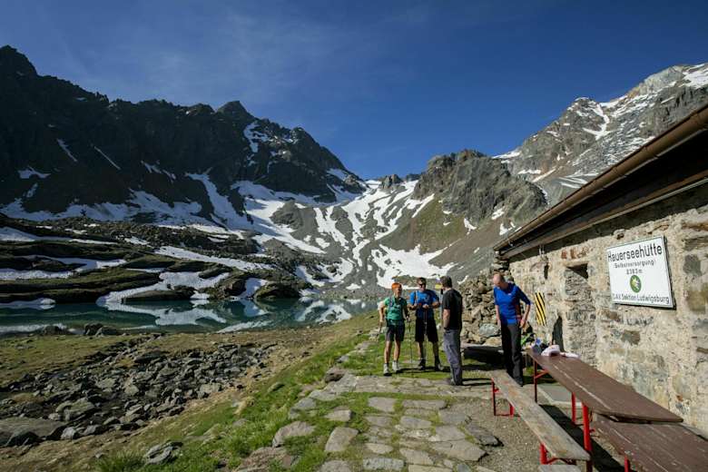 Eine schwierige, sehr lange Wanderung in den Ötztaler Alpen in Tirol mit mehreren Zwischenanstiegen von der Rüsselsheimer Hütte hinauf auf 2.914 m und hinunter zur romantischen Selbstversorgerhütte am Hauersee.