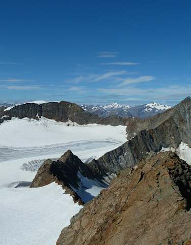 Ein anderer Steg führt rechter Hand vom Gletscherfeld hinunter! Man quert den Ferner im flachen oberen Teil in östlicher Richtung. Wegen eines Felssturzes darf der Weg zwischen Gletscher und Hauerseehütte nicht begangen werden, deswegen nimmt man den Weg im Verlauf des Gletschers in nordöstlicher Richtung. Am Ende der Gletscherpassage geht es rechts von einem Felskopf hinunter zur Hauerseehütte.