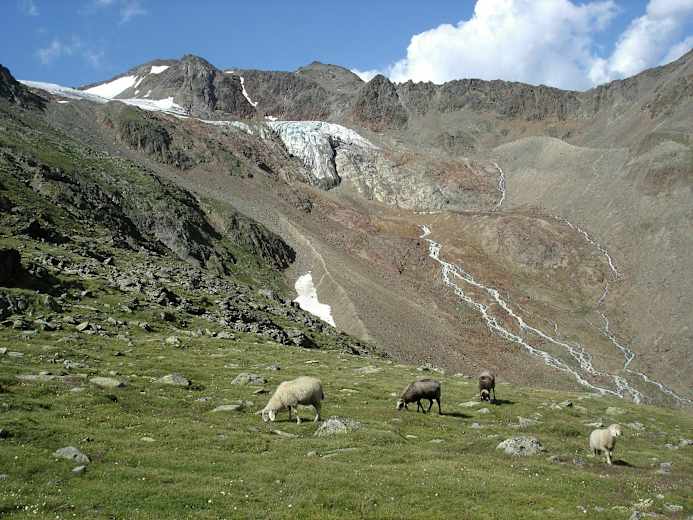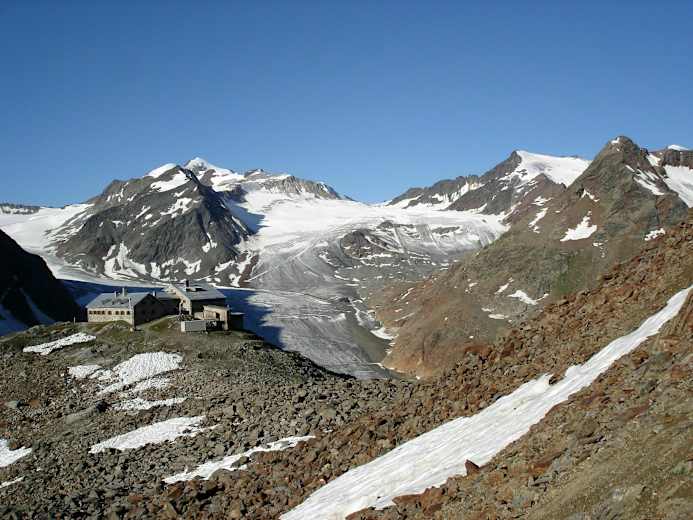 Nun links um den Felssporn herumgehen und weiter in nordwestlicher Richtung. Nun quert man auf der Bergseite des Gletscherbruchs zum Rettenbachjoch, wo sich die Liftstationen befinden. Schließlich wandert man bergab um zur Braunschweiger Hütte zu gelangen.