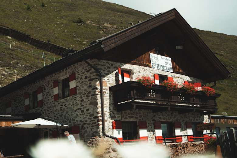 Von der Rettenbachalm mit ihrer großen Sonnenterrasse genießt man einen herrlichen Blick in Richtung Gletscher.