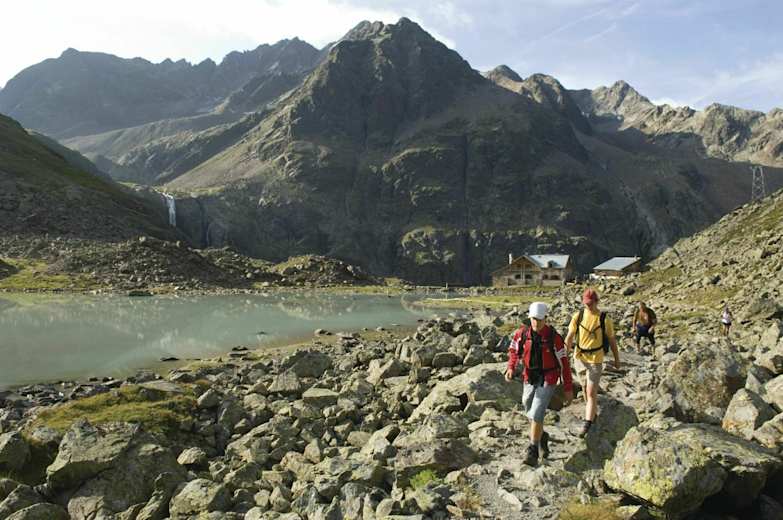 Eine Wanderung in den Ötztaler Alpen in Tirol, es handelt sich um einen Bergweg der Stufe rot (mittelschwierig).