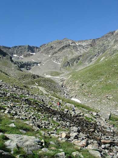 Über eine steile Passage gelangt man zur Dammkrone des Stausees. Auf der Ostseite des Sees marschiert man zum südlichen Seeufer. Hier beginnt ein steiler Anstieg, der in einen Kessel empor führt. Danach geht es hinunter und in Folge wieder bergauf, diesmal recht steil, und man gelangt zur Finstertaler Scharte.
