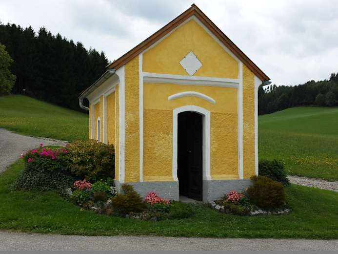 Jedoch sollte man sich bei Frau Johanna Hintermair unter der Telefonnummer 0676/840 160 566 anmelden. Denn sie begleitet dich sicher über die zahlreichen Stufen hinauf zum 60 Meter hohen Schanzentisch. Von dort kannst du in die Tiefe schauen und dich dabei wie ein Ski-Adler fühlen. Der einzigartige Ausblick über die sanft hügelige Landschaft des Innviertels bis hin zum Bayerischen Wald lohnt den steilen Aufstieg alle mal.Wieder festen Boden unter den Füßen geht es weiter zum großen Motorik-Park. Hier werden noch die eigenen koordinativen Fähigkeiten, sowie die Beweglichkeit und Kondition auf spielerische Weise trainiert. Danach führt der 3-Tannen-Weg (Nr. 9) weiter zur schönen Raider-Kapelle, welche zu einer kleinen Rast einlädt.TIPP: Ein wunderschöner Panoramablick auf den Ort Höhnhart und die Umgebung lässt sich genießen, wenn man oberhalb von Aigertsham am Waldrand entlang wandert.Nimmt man sich Zeit für die verschiedensten interessanten Aktivitäten entlang des 3-Tannen-Weges, sollte man insgesamt eine Gehzeit von drei Stunden veranschlagen bzw. wer noch zu wenig Höhenrausch erlebt hat, kann diesen Adrenalin-Kick auf dem 2 km entfernten einzigartigen Ski-Flyer nachholen.