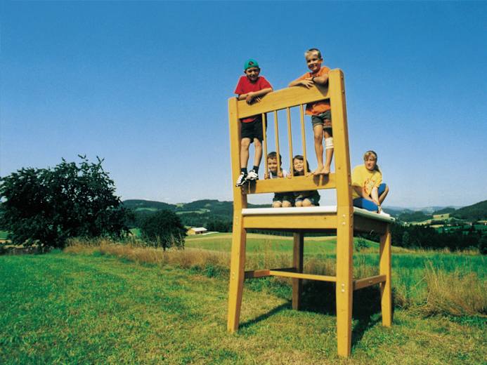 Der auf dem Weg befindeliche überdimensionale künstlerische Stuhl eignet sich hervorragend für ein Kinder-Fotomotiv, so wirken die Kleinen tatsächlich wie Zwerge am Hintergrund der hügeligen Landschaft!