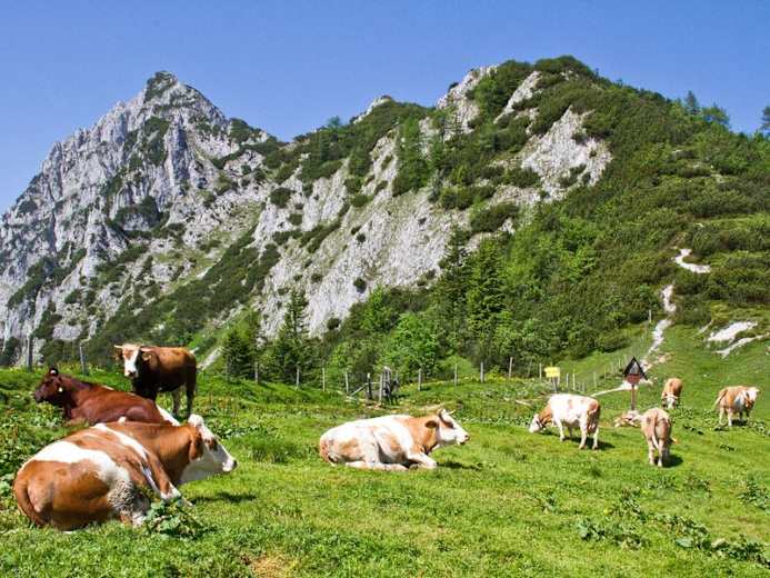 Die zwischen Bosruck und Großer Pyhrgas gelegene Ochsenwaldalm bietet auf 1.040 m einen fantastischen Ausblick auf die Berge. Die Ochsenwaldhütte lädt zum Jausnen ein.