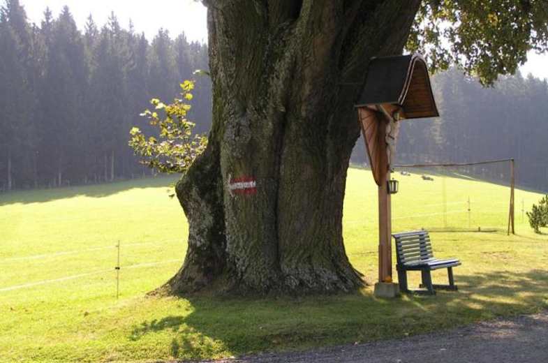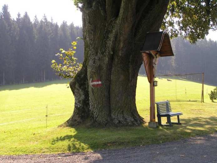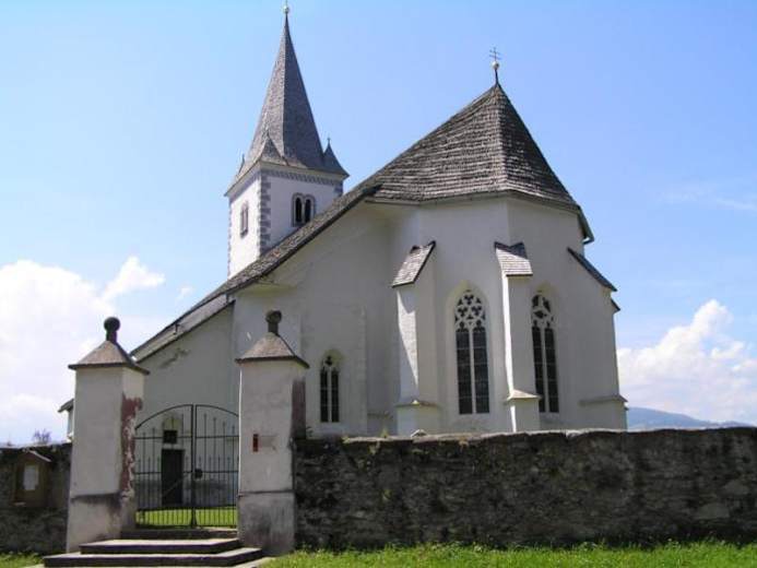 Nach links kurz bergab und dann rechts die Straße Richtung Prebl – nach ca. 1,5 km Gabelung –links halten, nach 200m rechts (Tafel:Gräbern) – nach 1 km Gabelung, links halten(in den Wald), bergan zur Kirche Gräbern (Kirchenschlüssel beim Bauern in der Kurve vor dem Transformator) km 12,7.Von Gräbern ca. 2,5 km Straße immer geradeaus bis rechts Abzweigung Wolfsberg-Auen – geradeaus weiter bis große Linde, Linkskurve – am Waldrand rechts bergan Wanderweg 330 (Hennereck).
