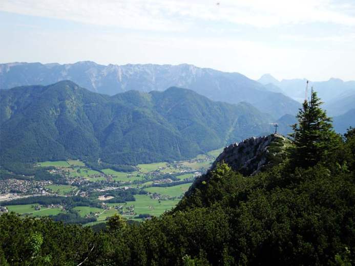 Beim Abstieg in östliche Richtung erreichen wir nach 10 Minuten eine Wegkreuzung (013°34’47“O - 47°41’18“N – 1.550m) mit dem direkten Anstiegsweg von der Seilbahnstation zur Katrin. Hier könnte man nach rechts sofort weiter absteigen. Es empfiehlt sich jedoch noch zur 5 Minuten entfernten Katrin mit ihrem mächtigen Kreuz zu wandern. Dort hat man nämlich einen prächtigen Tiefblick auf Bad Ischl.Den gekommenen Weg geht es die 5 Minuten wieder zurück. Nun halten wir uns aber geradeaus. Nach einem Flachstück sehen wir bereits die Seilbahnstation unter uns. Auf gutem Weg steigen wir in sechs Kehren zu dieser ab.