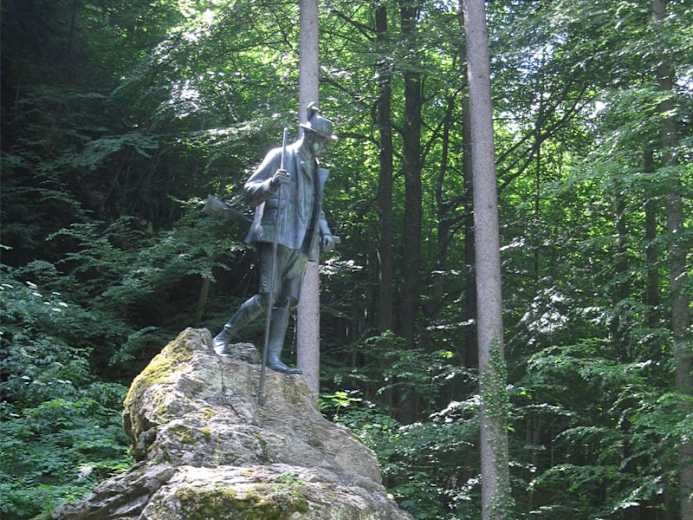 Kurze Zeit später kommen wir zum Kaiser Jagdstandbild (links unterhalb des Weges), welches 1910 anlässlich des 80. Geburtstages von Kaiser Franz Josef errichtet wurde. Dem schattigen Soleleitungsweg folgend erreichen wir, zuletzt ein Stück auf der asphaltierten Engleithenstraße, das historische Lauffen. Bei der Zughaltestelle könnte man bei Benützung der Straßenbrücke unsere Rundwanderung um etwa 15 Minuten verkürzen. Es empfiehlt sich jedoch die Schießstattstraße (nicht den Soleleitungsweg) weiterzugehen und die Traun auf einem Steg, der über den „Wilden Lauffen“ führt, zu überqueren. Diese Stelle der Traun bildete mehrere Jahrhunderte ein gefährliches Hindernis für die Salzschifffahrt.