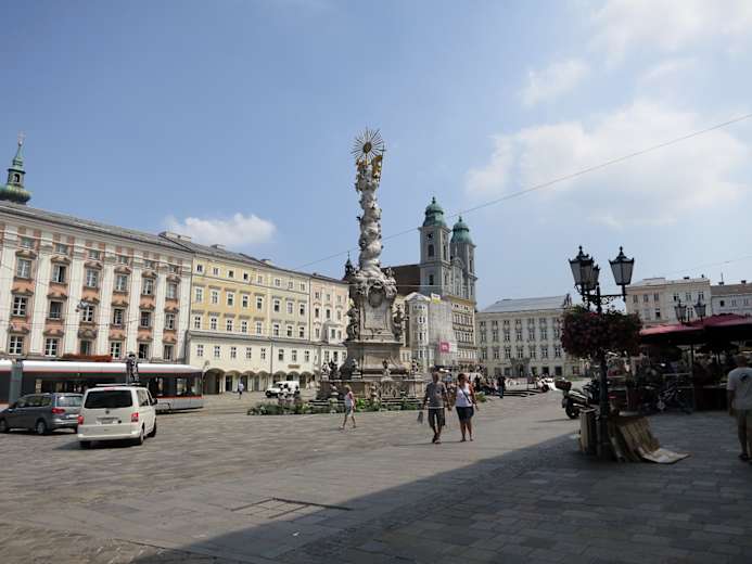 Der prächtige Linzer Hauptplatz ist Ausgangspunkt für diese Donausteig-Etappe. Mit der Straßenbahn fahren wir von hier nach Ebelsberg, einem Stadtteil von Linz am Südostrand des Linzer Beckens. Einst eigenständiger Markt, ging Ebelsberg durch seinen strategisch wichtigen Übergang über den Traunfluss in die Weltgeschichte ein.