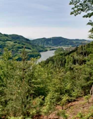 Vom Donausteig-Rastplatz unterhalb der Kirche haben wir einen wundervollen Blick zurück auf die einstigen Gefahrenstellen. Der letzte Wegabschnitt ist ein absolutes Wanderhighlight! Zuerst führt uns der uralte Kirchenweg durch herrlichen Waldbestand die Talflanke hoch. Dann wandern wir einsam durch stimmungsvolle Mischwälder entlang des Donautales vorbei an einzelnen Wiesen bis zur Moststation Kleinleitner. Hier eröffnet sich ein grandioser Blick weit über das Ende des wilden Strudengaus hinaus - bis zum Ötscher.