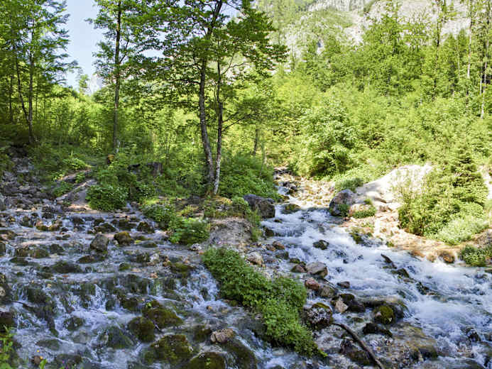 Zurück an den Ursprung: vom Gasthof Steyrbrück geht es den Flötzersteig entlang bis zum Ursprung der Steyr, wo das Wasser aus vielen hunderten Löchern herausschießt. Zwischendurch hat man prachtvolle Ausblicke auf die Nord- und Ostflanken des Kleinen Priels und die zum Teil schroffe Bergwelt der Oberösterreichischen Voralpen.