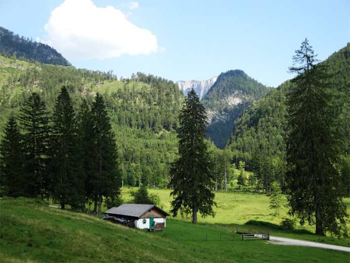 Vom Parkplatz in der Rettenbach Alm folgen wir der Forststraße 200 m Tal einwärts zum Wegweiser bei einer Brücke. Hier verlassen wir die Straße nach links und gehen kurz dem Bach entlang, dann über die Almwiese leicht rechts haltend flach an Hütten vorbei zum etwa 250 m entfernten Waldrand. Nun auf deutlichem Weg aufsteigend erreichen wir nach 15 Minuten eine Forststraße, die in weiterer Folge bis zur Wurzerhütte (013°44’00“O - 47°42’29“N - 1.290 m) achtmal überquert werden muss. Nach dem Überschreiten einer weiteren Forststraße sind es nur mehr wenige Minuten zur Jagdhütte auf der Hinteralm (013°43’56“O - 47°42’38“N - 1.360 m).