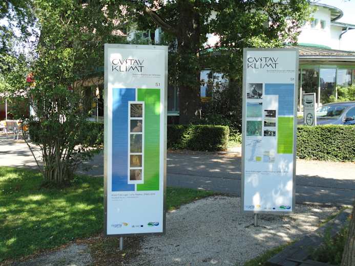 Sowohl auf der Schörflinger als auch auf der Seewalchner Seite dokumentieren Stelen das Leben und Wirken des berühmten Künstlers am Attersee.Einige der Klimt-Informationstafeln sind beweglich und mit quadratischen Ausschnitten versehen. Beim Blick durch diese Ausschnitte kann man – ähnlich wie es der Meister vor über 100 Jahren mit einem sogenannten \"Sucher\" aus Pappe getan hat – seine eigenen \"Klimt-Landschaften\" komponieren. Ein zweisprachiger Text und ausgewählte Gemäldereproduktionen sowie historische Fotografien begleiten auf dieser Entdeckungsreise. Da dieser Weg eben ist, kann er auch mit Kinderwagen oder Rollstuhl befahren werden.
