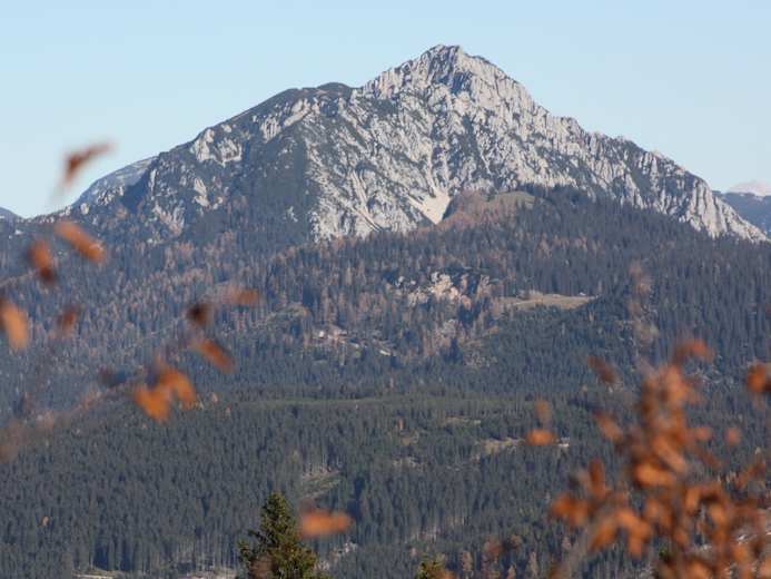 Nachdem wir diese Stelle überwunden haben, kann man schon den herrlichen Ausblick auf das gewaltige Dachsteinmassiv genießen.Am Gipfel mit seinem imposanten Gipfelkreuz angekommen bietet sich ein einzigartiger Rundblick; in unendlicher Schönheit zeigen sich die Zinnen des Gosaukammes, an klaren Tagen kann man nicht nur den Schafberg am Wolfgangsee, sondern auch die bayrischen Berge sehen. Der Abstieg erfolgt dann auf dem Weg Nr. 643, auf den man in der Einsenkung unterhalb des Gipfels links kommt. Vorbei an Felstürmen und in Serpentinen durch Schrofen und Latschen hinab in einen felsigen Graben.