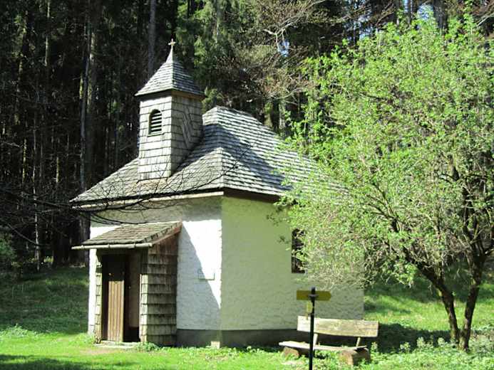 Bei der Autobahnunterführung hält man sich links um gleich darauf rechts in den Wald hinein abzubiegen. Man folgt dem Wanderweg mit der Nummer 2 bis über den Hauberg und weiter über den Mondseeberg zur Radstattkapelle.
